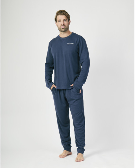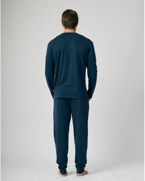 Conjunto de pijama masculino confeccionado en tejido cálido y suave, ideal para el invierno. Está compuesto por una camiseta de manga larga en azul marino liso con detalle bordado en el pecho y un pantalón largo a juego en el mismo tono. Su estilo minimalista y atemporal ofrece comodidad y elegancia, convirtiéndolo en una prenda perfecta para descansar con confort y discreción en las noches frías.