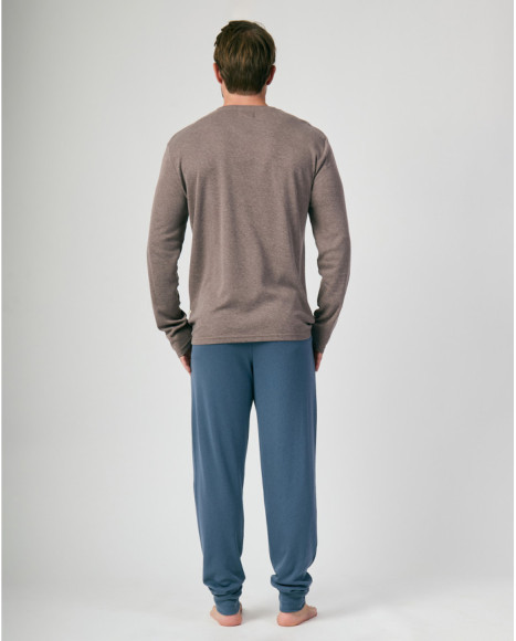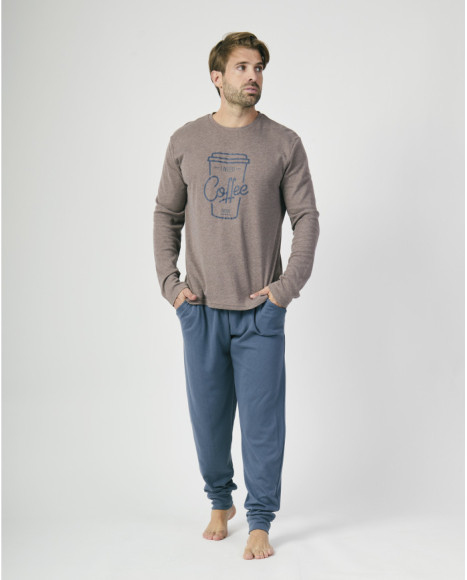 Conjunto de pijama masculino confeccionado en tejido suave y confortable, compuesto por una camiseta de manga larga en tono marrón con estampado frontal de vaso de café y un pantalón largo liso en azul. Su diseño moderno y juvenil combina estilo y comodidad, convirtiéndolo en la elección ideal para descansar en casa con un aire actual.
