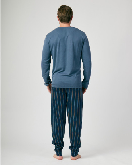 Pijama de hombre en tejido cálido y confortable, compuesto por una camiseta de manga larga en azul con detalle tipográfico en un lateral y un pantalón largo en azul marino con estampado de rayas finas en contraste. Su diseño actual y juvenil combina comodidad y estilo, ideal para disfrutar del descanso en casa durante los días más fríos.