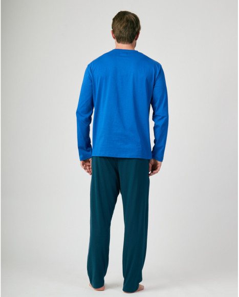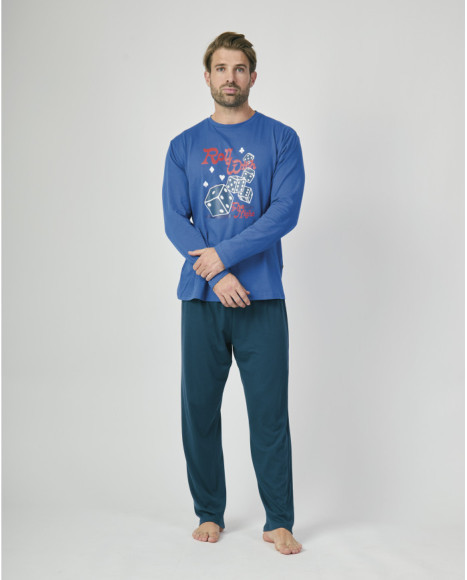 Pijama de hombre confeccionado en tejido suave y cómodo, compuesto por una camiseta de manga larga en color azul con estampado de dados y letras en contraste, aportando un estilo divertido y original. El conjunto se completa con un pantalón largo liso en color verde oscuro, de corte relajado que garantiza libertad de movimiento y confort durante la noche. Ideal para descansar en casa con un look moderno y desenfadado.