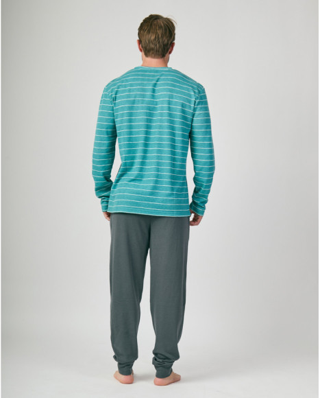 Pijama largo para hombre confeccionado en tejido suave y cómodo, ideal para el descanso diario. La camiseta de manga larga en color verde con finas rayas blancas luce un divertido estampado de Snoopy en la parte frontal, aportando un aire juvenil y desenfadado. El pantalón largo en color gris oscuro, de corte recto y ajuste relajado, completa este conjunto práctico y moderno. Perfecto para disfrutar de la noche con confort y estilo divertido.