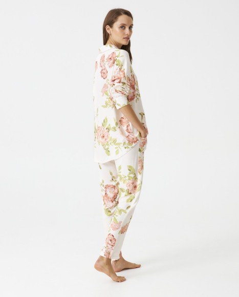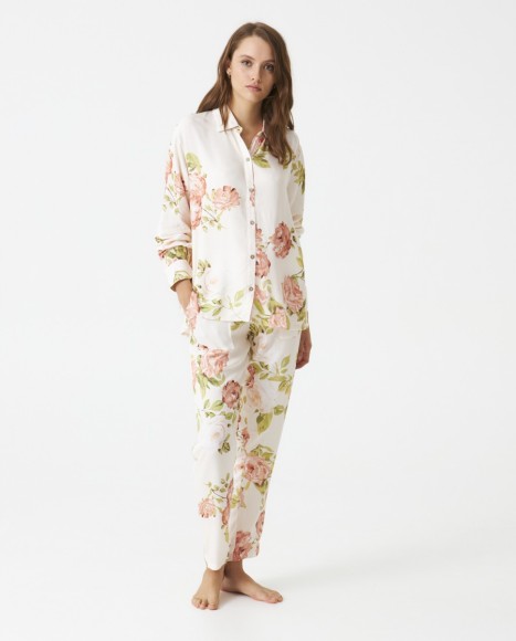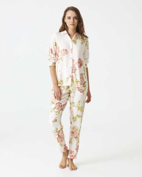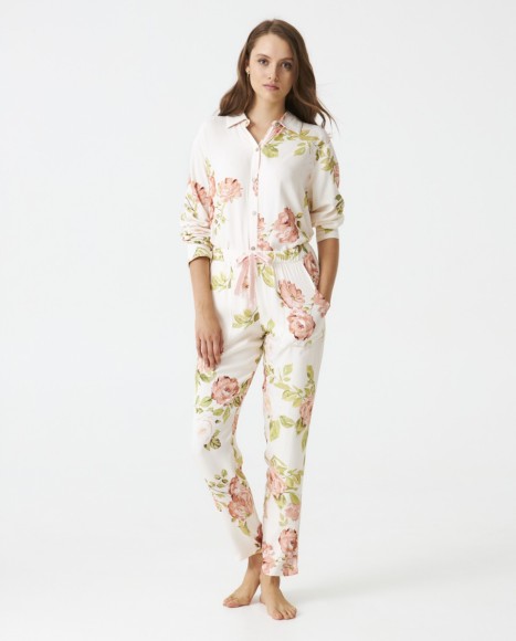 Pijama señora viscosa estampado flores. Abierto con tapeta contraste. Pantalón con bolsillos laterales.