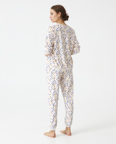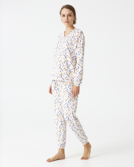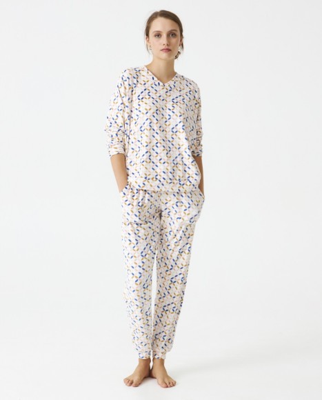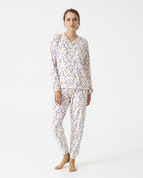 Pijama señora en terciopelo estampado geométrico. Cuello pico, con puños y bajos. Pantalón con bolsillos centrales.