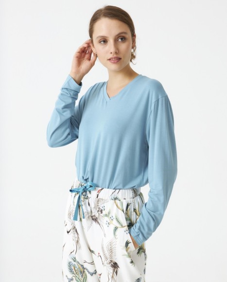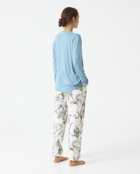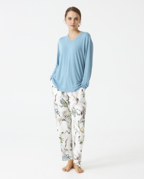 Pijama señora. Top en punto viscosa liso, cuello pico. Pantalón en viscosa estampada con bolsillos laterales y cinta satinada.