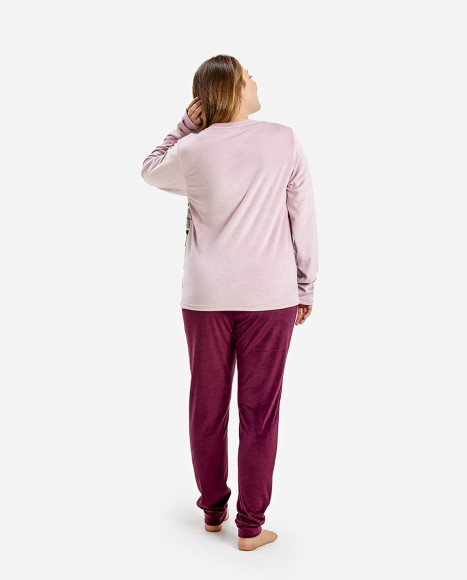 Pijama compuesto de camiseta manga larga de color rosa palo y rayas, cuello redondo y pantalón largo en color burdeos. Pijama confeccionado con terciopelo de gran suavidad y muy confortable por su calidez y tacto.