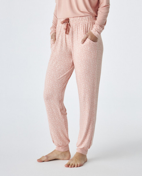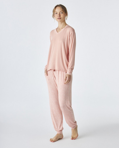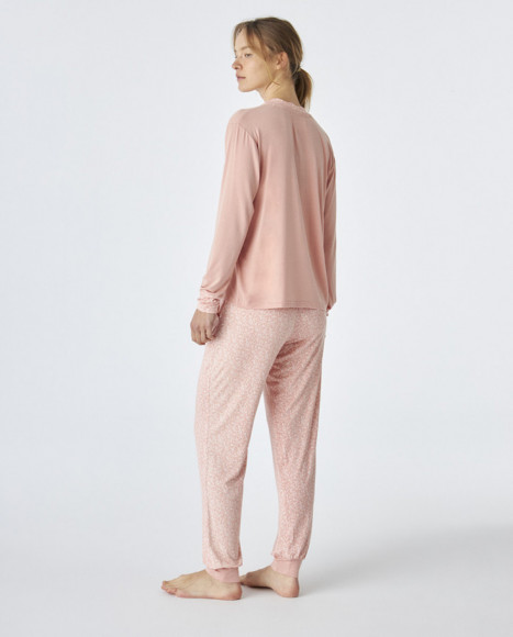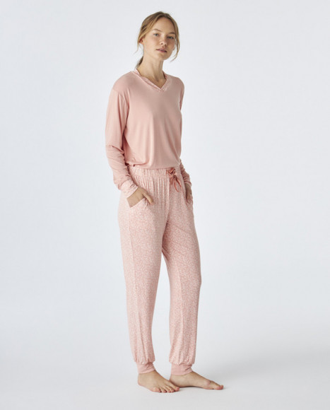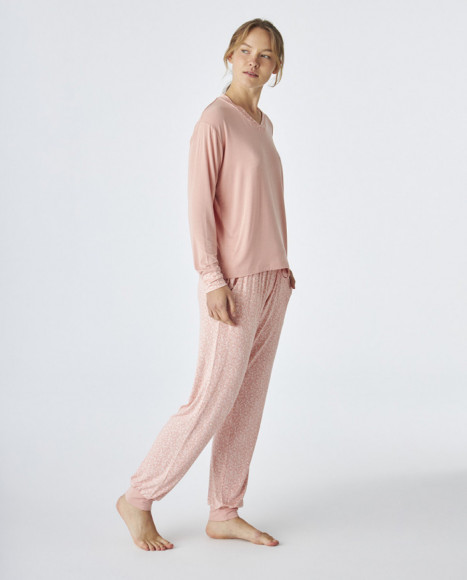 Pijama en tejido modal de dos piezas para mujer, elaborado en un tejido suave y transpirable que asegura comodidad durante toda la noche. La parte superior destaca por su diseño de manga larga y cuello en V con delicados detalles en encaje que aportan un toque femenino y elegante. El pantalón, con cintura elástica y corte relajado, permite libertad de movimiento y confort. Todo el conjunto presenta un sutil estampado floral en tonos rosa pastel