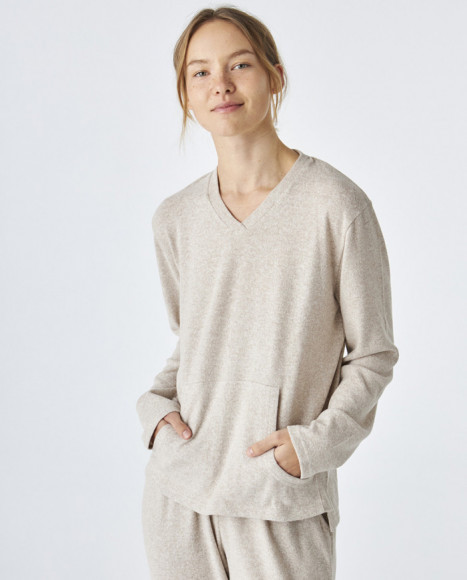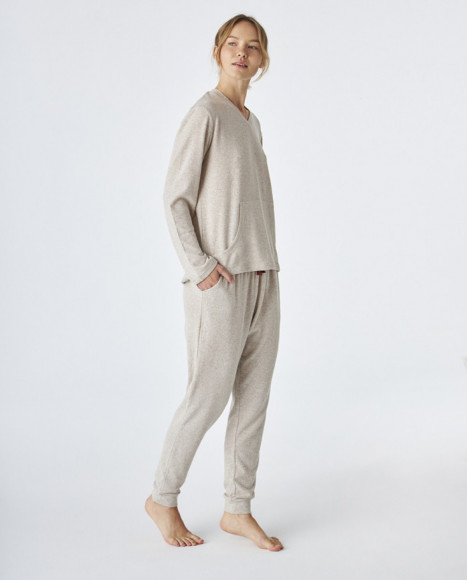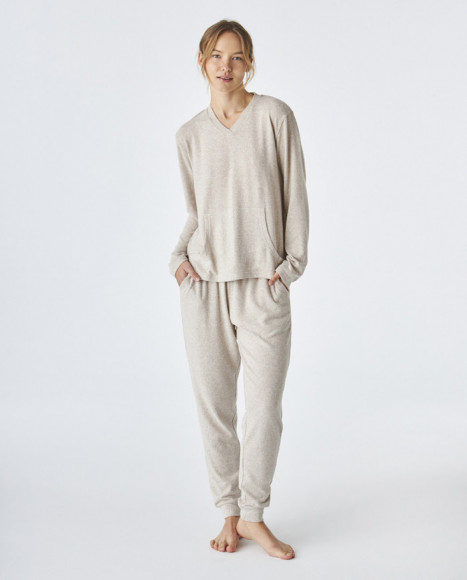 Pijama de punto de dos piezas para mujer, confeccionado en un tejido suave y cálido, ideal para noches de descanso. La parte superior, de manga larga y cuello en V, cuenta con un práctico bolsillo tipo canguro que le añade un toque casual y moderno. El pantalón a juego tiene cintura elástica y puños en los tobillos para un ajuste cómodo. Su diseño en color beige lo convierte en una opción sencilla y elegante