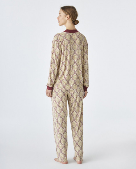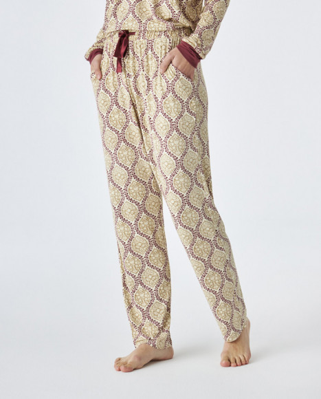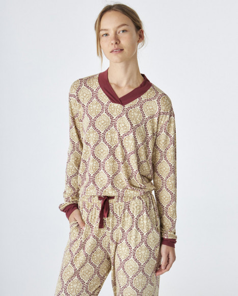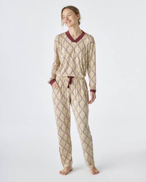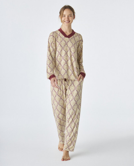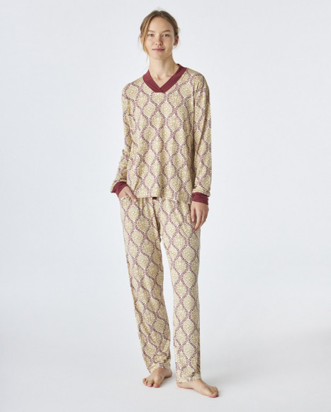 Pijama en tejido modal para mujer en tonos beige y burdeos, con un atractivo estampado geométrico que le aporta un toque moderno y estilizado. La parte superior cuenta con un cuello en V y mangas largas, mientras que el pantalón presenta una cintura elástica para mayor comodidad. El contraste en burdeos en los puños y el cuello le añade un detalle elegante