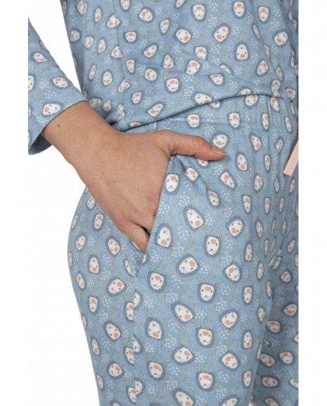Pijama para mujer de dos piezas en tono azul celeste, diseñado para ofrecer confort y estilo. La camiseta y el pantalón presentan un estampado completo de pequeños rostros sonrientes, añadiendo un toque alegre y original al conjunto. La cintura del pantalón es ajustable mediante un lazo decorativo en color rosa, aportando un contraste encantador y permitiendo un ajuste cómodo. Este conjunto es ideal para descansar con estilo y comodidad en cualquier época del año