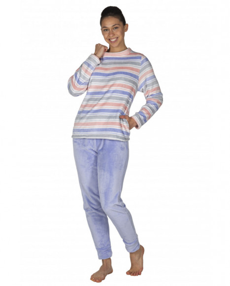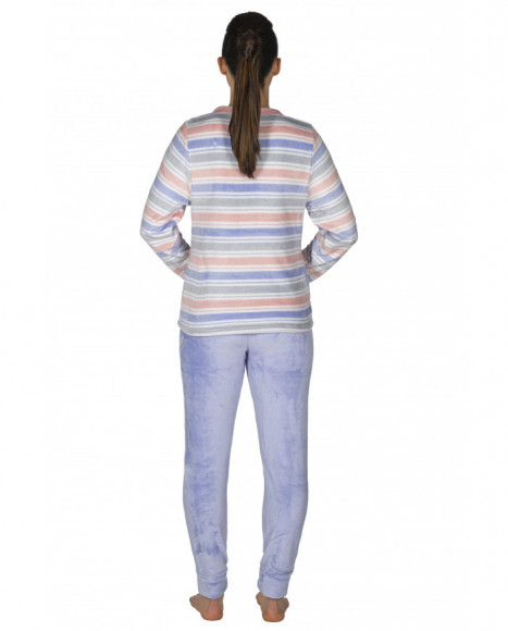 Pijama de coralina para mujer compuesto por una camiseta de manga larga con estampado de rayas en tonos pastel de rosa, azul y gris, y un pantalón largo en color azul. La camiseta presenta un diseño cómodo y cálido, ideal para las noches frescas. El pantalón de suave textura tiene un ajuste relajado y un corte recto. Confeccionado en materiales suaves y cálidos, este conjunto es perfecto para el descanso en casa