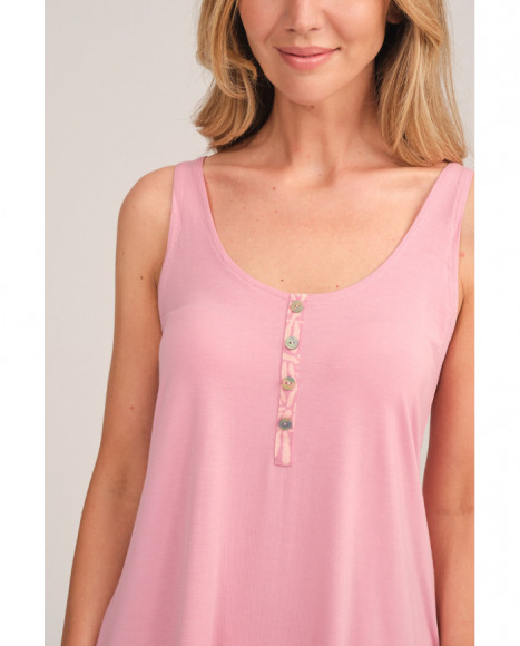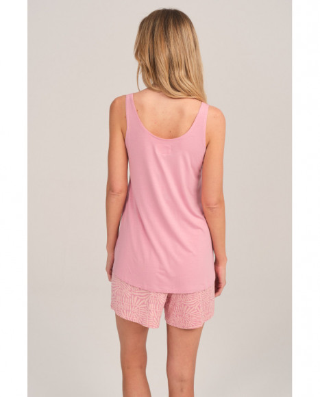 Pijama para mujer compuesto por una camiseta sin mangas en tono rosa suave, adornada con botones decorativos en el escote, y un pantalón corto con estampado floral. Diseñado con un tejido ligero y suave para proporcionar comodidad y frescura durante el descanso.