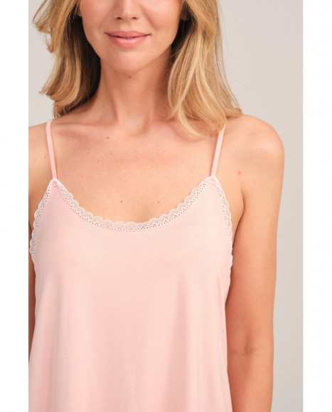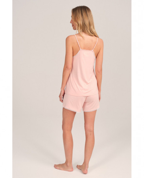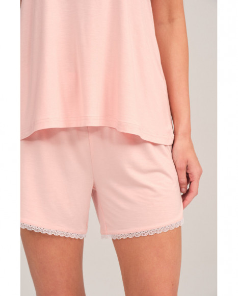 Pijama corto para mujer con un diseño femenino y delicado. Incluye un top de tirantes finos con detalle de encaje en el escote y pantalones cortos con acabado de encaje en los bordes.