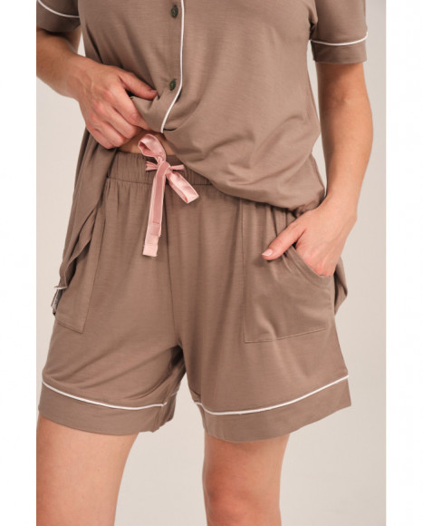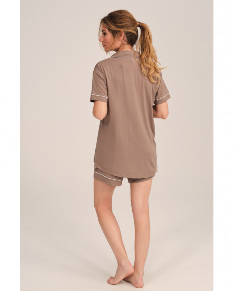 Pijama mujer con camisa marrón y pantalón corto con ribetes