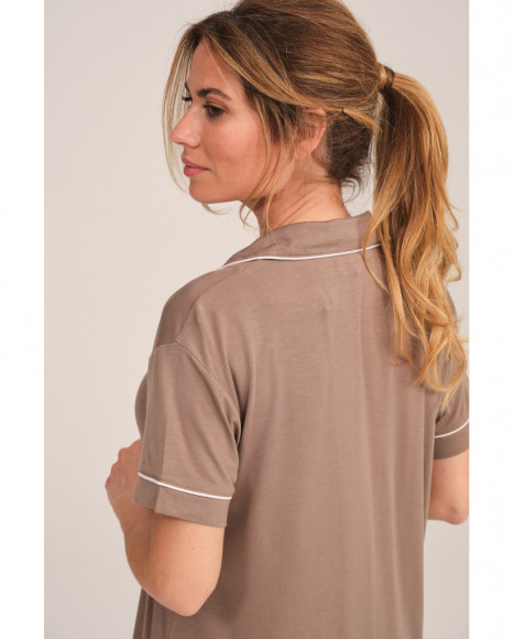 Pijama para mujer compuesto por una camisa de manga corta en color marrón con botones frontales y ribetes blancos que aportan un toque clásico y elegante, acompañado de un pantalón corto a juego con cintura elástica para mayor comodidad. Este conjunto ofrece un diseño fluido y ligero, ideal para descansar con estilo y confort durante las noches cálidas.