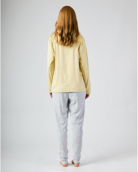 Pijama largo para mujer con camiseta amarilla y pantalón estampado