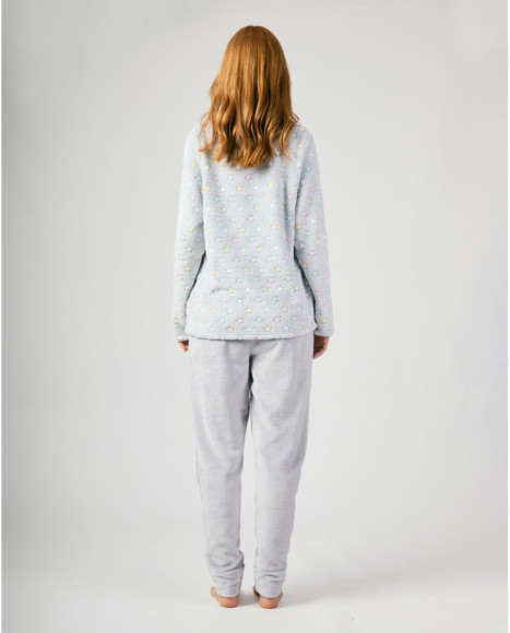 Pijama largo para mujer compuesto por una camiseta de manga larga en tono gris claro con estampado integral de pequeñas estrellas en colores pastel y un pantalón liso a juego en gris. El conjunto destaca por su estilo delicado y femenino, aportando suavidad y comodidad para los momentos de descanso. Ideal para las noches más frías o para disfrutar de la tranquilidad en casa con un toque acogedor.
