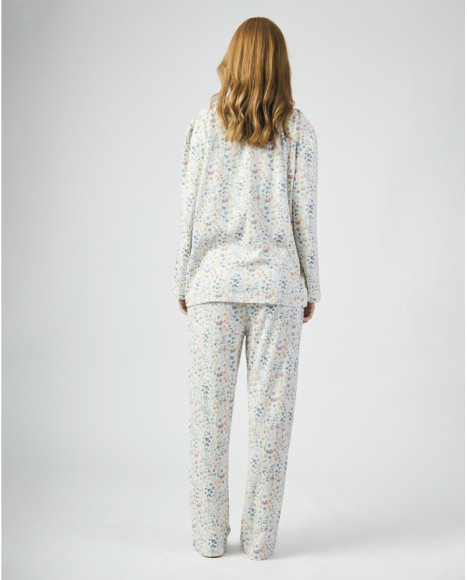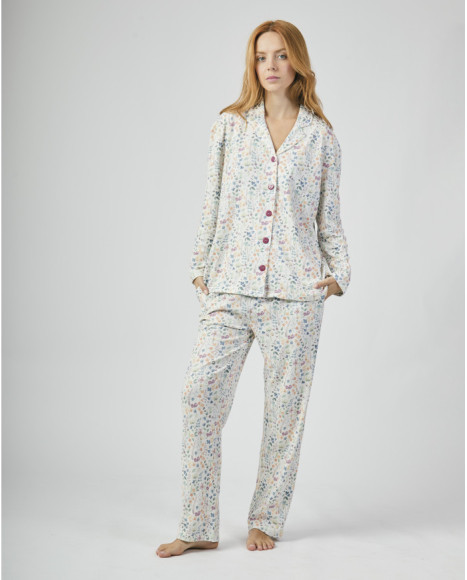 Pijama largo para mujer en color claro con estampado floral multicolor. La camiseta de manga larga cuenta con cuello solapa, botones delanteros en contraste y un diseño clásico que aporta elegancia y comodidad. El pantalón a juego completa un conjunto fresco y alegre, ideal para disfrutar de noches relajadas en casa con un toque de estilo.