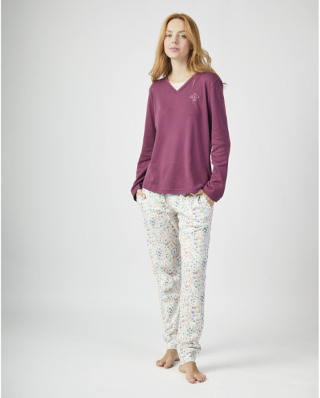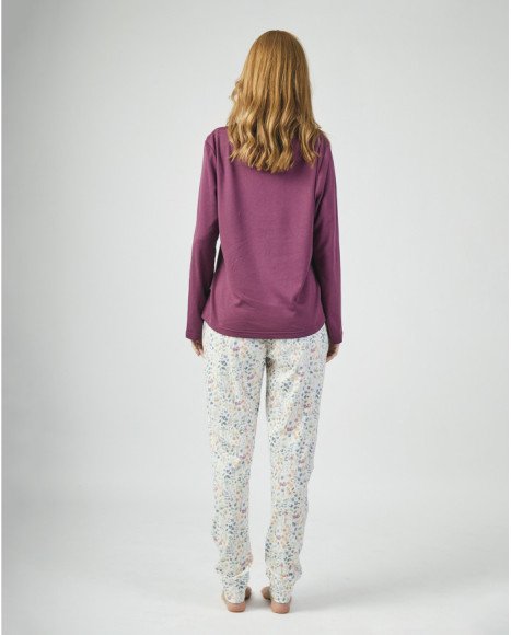 Pijama largo para mujer compuesto por una camiseta de manga larga en color morado con escote en pico y pequeño detalle bordado, combinada con un pantalón en tono claro estampado con flores multicolor. El contraste entre la parte superior lisa y el pantalón estampado crea un estilo fresco y femenino. Ideal para los días fríos, ofreciendo calidez y comodidad en los momentos de descanso en casa.