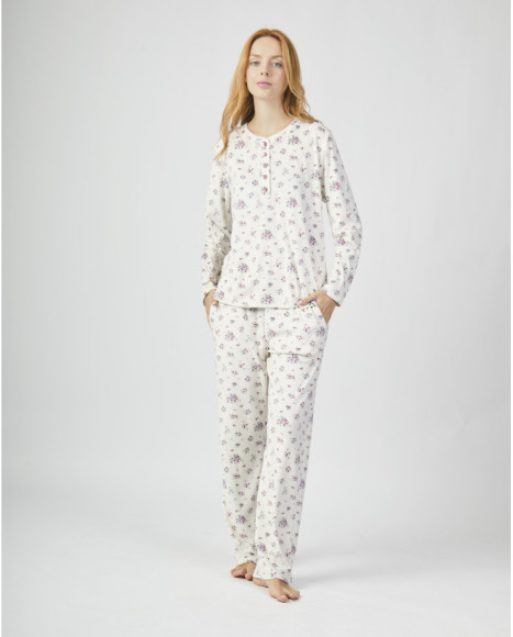 Pijama largo para mujer en tono claro con estampado de pequeñas flores lilas distribuidas por la camiseta de manga larga y el pantalón a juego. Su diseño delicado y femenino aporta un aire romántico y fresco, a la vez que ofrece comodidad y libertad de movimiento. Ideal para los días fríos, garantizando calidez y un descanso acogedor en casa.