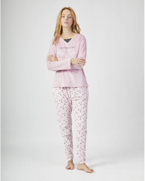 Pijama de mujer en tonos lilas, compuesto por camiseta de manga larga con cuello en pico adornado con encaje negro y mensaje estampado “KEEP THE SECRET” en el frente. El pantalón largo presenta un estampado de pequeños lazos en contraste, añadiendo un aire delicado y femenino. Confeccionado en tejido suave y cálido, ideal para la temporada de invierno y para quienes buscan comodidad con un toque coqueto.