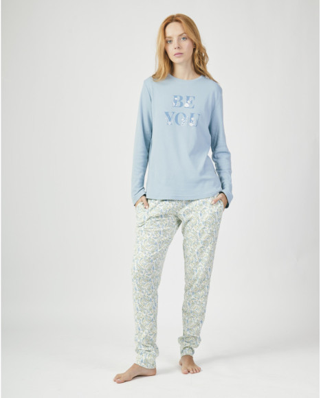 Conjunto de pijama de mujer compuesto por camiseta celeste de manga larga con mensaje estampado "BE YOU" y pantalón largo con un delicado estampado paisley en tonos verdes y azules. Un diseño juvenil, cómodo y suave, ideal para sentirse abrigada y relajada en casa durante el invierno.
