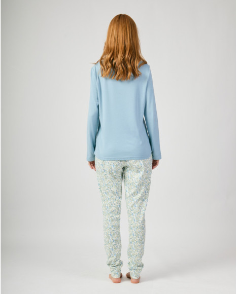 Conjunto de pijama de mujer con camiseta celeste y pantalón estampado paisley