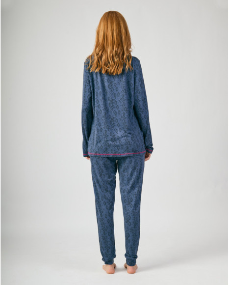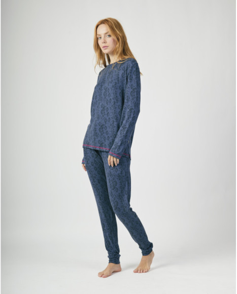 Pijama de mujer en color azul marino con estampado discreto en toda la prenda. El conjunto incluye camiseta de manga larga y pantalón largo a juego, ambos confeccionados en tejido suave y cálido, ideal para las noches de invierno. Los ribetes en contraste y los detalles de encaje aportan un toque femenino y sofisticado. Perfecto para descansar con estilo y comodidad.