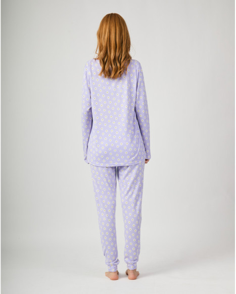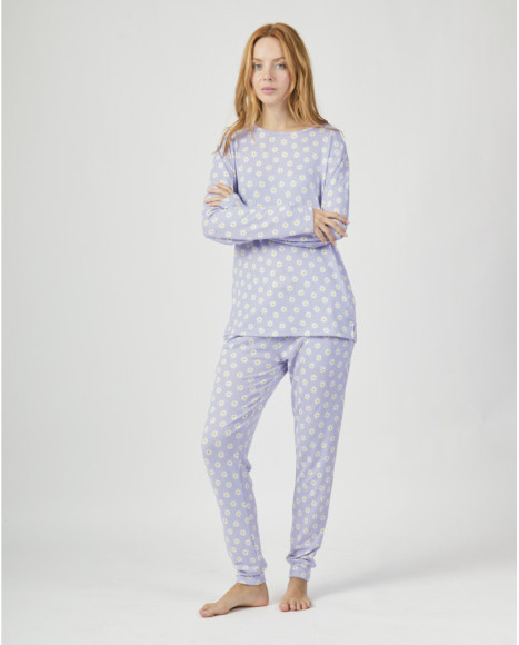 Pijama de mujer confeccionado en tejido suave y cálido, formado por una camiseta de manga larga y un pantalón largo, ambos en color lavanda con un alegre estampado de margaritas en blanco y amarillo. El diseño integral de flores aporta frescura y estilo juvenil, mientras que la cintura elástica del pantalón ofrece un ajuste cómodo para moverse con libertad. Una opción ideal para las noches frías, combinando confort y un toque divertido en el descanso en casa.