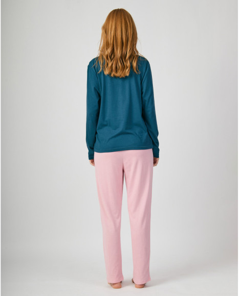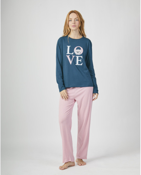 Pijama de mujer compuesto por una camiseta de manga larga en color azul marino con estampado frontal de letras y detalle gráfico divertido, combinada con un pantalón largo liso en tono rosa claro. El tejido ligero y agradable al tacto aporta confort, mientras que el diseño moderno une estilo y comodidad en una misma prenda. Perfecto para relajarse en casa y disfrutar de un descanso cómodo con un toque actual.