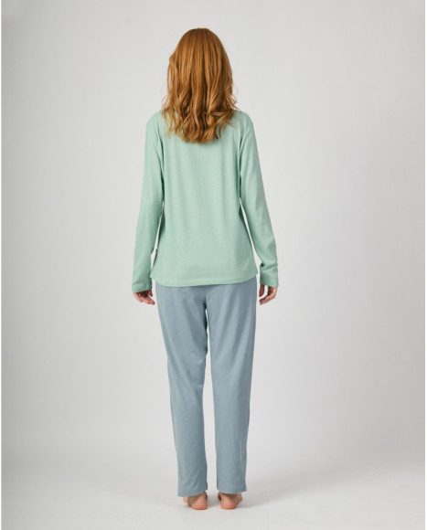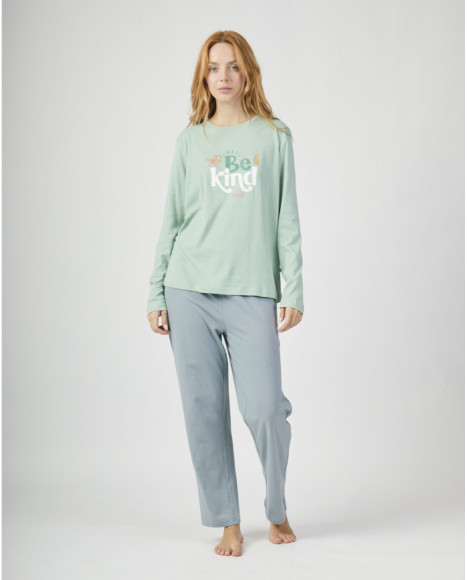 Pijama de mujer compuesto por una camiseta de manga larga en color verde claro con estampado frontal de letras y pequeños detalles gráficos, combinada con un pantalón largo liso en tono verde más oscuro. El conjunto, confeccionado en tejido suave y agradable, proporciona comodidad y libertad de movimiento, ideal para descansar en casa. Su diseño sencillo con un toque fresco convierte esta prenda en una elección perfecta para las noches de invierno.