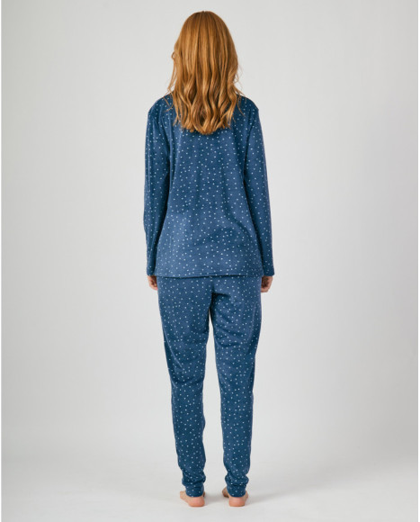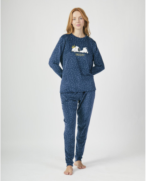 Pijama de mujer confeccionado en tejido cálido y agradable, formado por una camiseta de manga larga en color azul marino con estampado central de Snoopy y pequeños lunares blancos, a juego con un pantalón largo del mismo diseño. Su estilo divertido y juvenil aporta un aire desenfadado, mientras que el corte cómodo y la suavidad del tejido garantizan confort en el descanso. Una opción ideal para las noches frías, combinando calidez y un toque simpático.