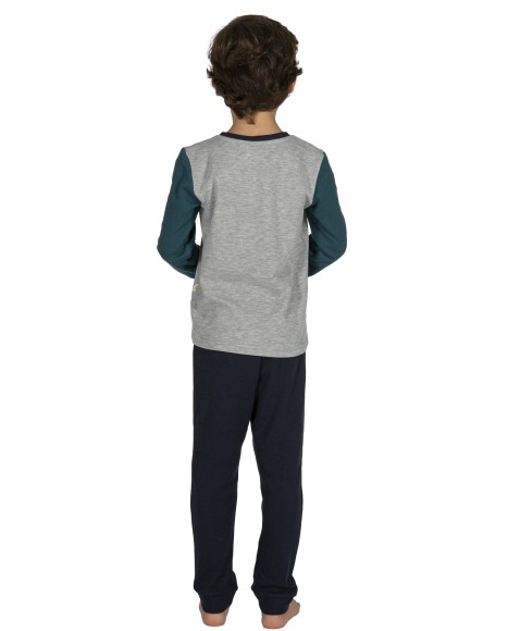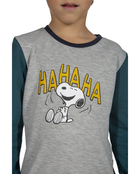 Pijama de niño SNOOPY, compuesto por una camiseta con manga en color gris vigoré/verde y cuello redondo. Pantalón largo en color azul marino.