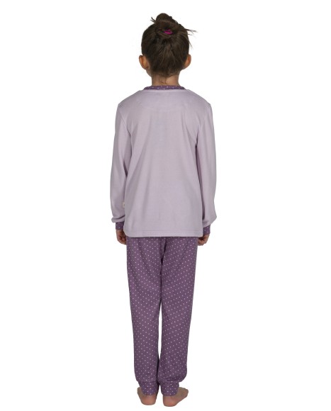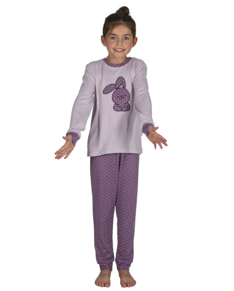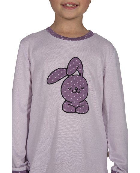 Pijama de niña de con tacto extra suave compuesto por una camiseta de manga larga con cuello redondo en color malva, con un motivo de un conejo estampado en el pecho. Pantalón largo en color morado estampado con mini topitos.