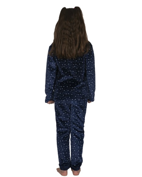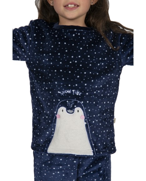 Pijama de niña de coralina compuesto por una camiseta de manga larga en color azul marino y cuello redondo, con un motivo de un pingüino bordado. Pantalón largo estampado con mini topitos en color blanco sobre fondo azul marino.