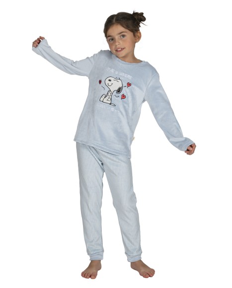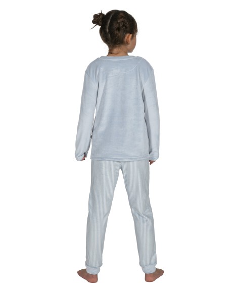 Pijama de niña de terciopelo extra suave compuesto por una camiseta de manga larga en color azul cielo y cuello redondo. Pantalón largo, estampado con mil rayas en tonos blanco y azul cielo.