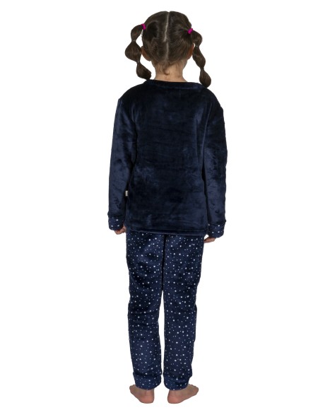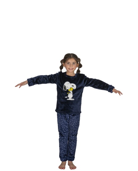 Pijama de niña de SNOOPY de coralina compuesto por una camiseta de manga larga en color azul marino y cuello redondo. Pantalón largo estampado con mini topitos en color blanco sobre fondo azul marino.