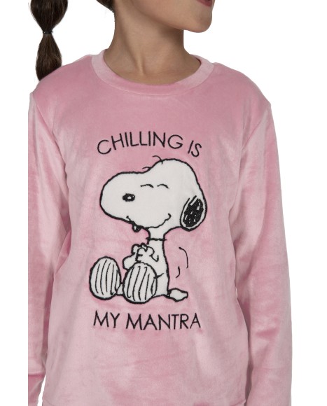Pijama de niña de SNOOPY de terciopelo extra suave compuesto por una camiseta de manga larga en color rosa y cuello redondo. Pantalón largo, estampado con topos de colores.
