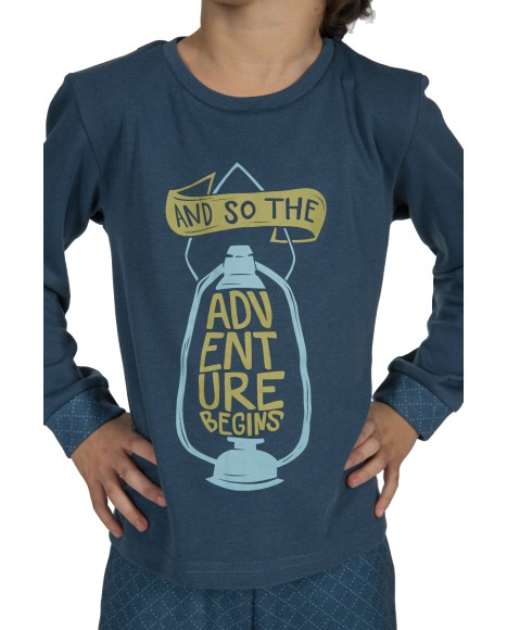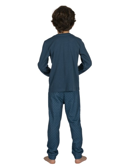Pijama de niño compuesto por una camiseta de manga larga y cuello redondo, en tono azul petróleo. Pantalón largo con estampado con rombos.