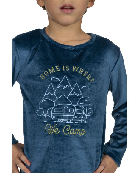 Pijama de niño de terciopelo extra suave compuesto por una camiseta de manga larga y cuello redondoen color azul petróleo. Pantalón largo con rayas azules y ocres.