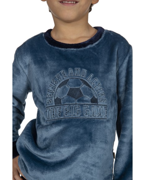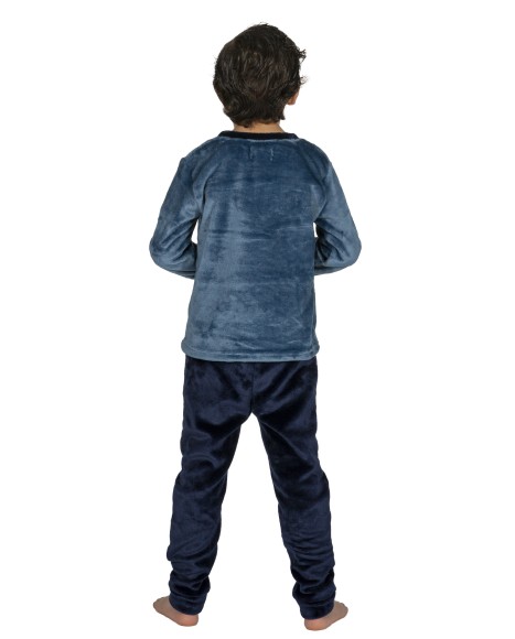 Pijama de niño de coralina compuesto por una camiseta de manga larga y cuello redondo en tono azul. Pantalón largo en color azul marino.