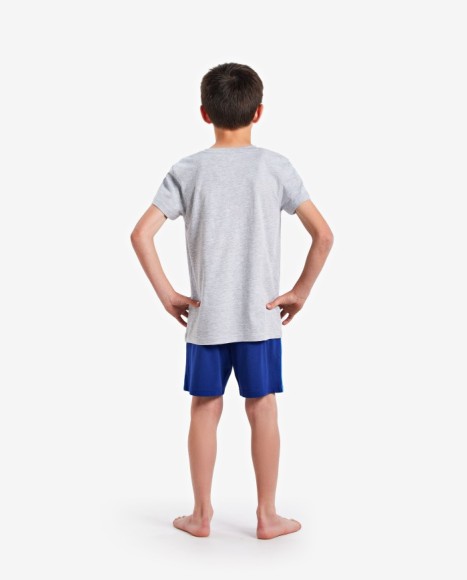 Pijama de niño compuesto de camiseta manga corta de color gris claro vigoré de cuello redondo y pantalón corto de color azul marino, ambos confeccionados con algodón y modal de gran calidad y suavidad al tacto.