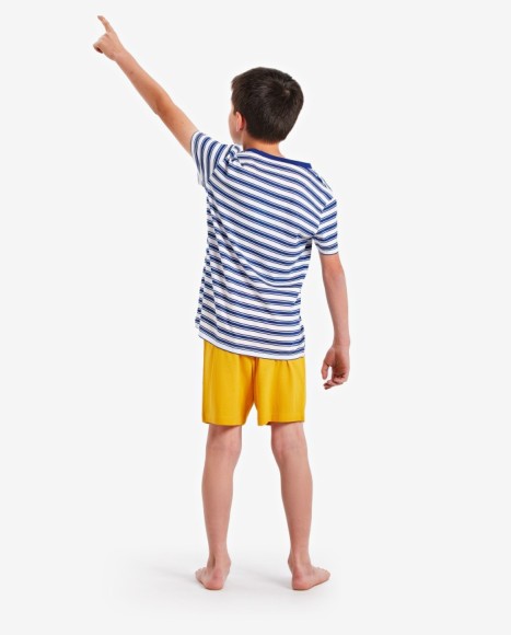 Pijama de niño compuesto de camiseta estampada con rayas marineras, manga corta, cuello redondo y pantalón corto de color mostaza, ambos confeccionados con algodón y modal de gran calidad y suavidad al tacto.