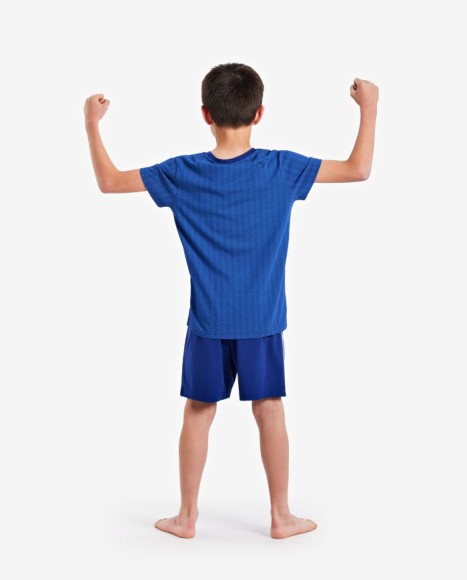 Pijama largo de niño compuesto de camiseta manga corta estampada en tonos azules, cuello redondo y pantalón corto de color azul marino, ambos confeccionados con algodón de gran calidad y suavidad al tacto.