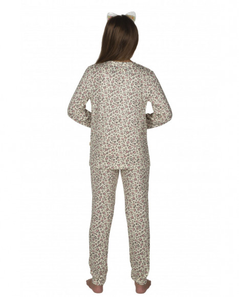 Pijama para niña de dos piezas en estampado de animal print en tonos neutros. La camiseta de manga larga y el pantalón ofrecen un diseño suave y cómodo, ideal para descansar. El detalle de un pequeño lazo decorativo en la cintura añade un toque delicado. Perfecto para mantener el estilo y la comodidad en casa