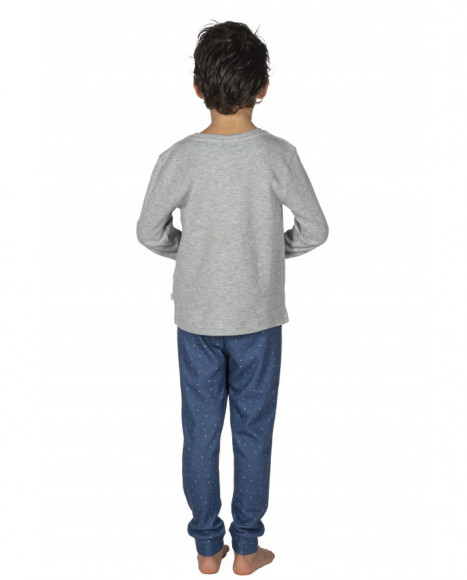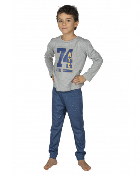Pijama para niño en tonos grises y azul marino, con un diseño deportivo inspirado en NYC. La camiseta de manga larga en color gris lleva un estampado en el pecho con los números "74" en azul y letras en amarillo, evocando un estilo atlético y urbano. El pantalón azul con pequeños detalles estampados añade un toque moderno y cómodo. Ideal para los pequeños que buscan estilo y confort en sus noches