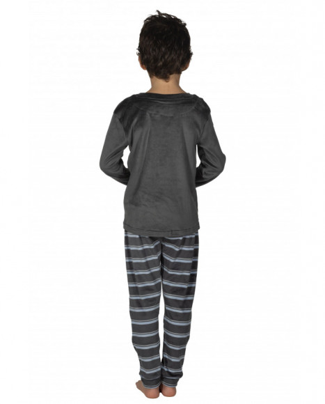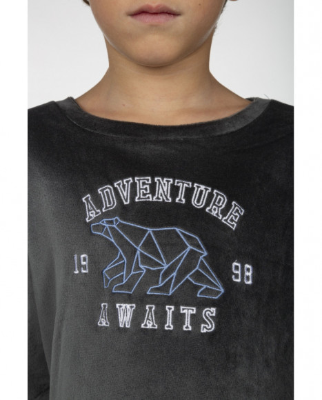 Pijama de terciopelo para niño en tonos grises, compuesto por una camiseta de manga larga con diseño de oso geométrico y mensaje "Adventure Awaits", que inspira a la aventura. El pantalón presenta un estampado de rayas en tonos grises y blancos, aportando un toque moderno y dinámico. Ideal para una noche de descanso con estilo y comodidad