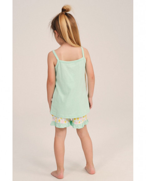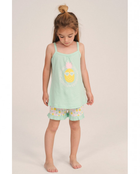 Pijama de tirantes para niña con un diseño divertido y fresco. La parte superior, en color verde menta, presenta un estampado central de piña con detalles en tonos pastel. El pantalón corto, a juego, tiene un estampado de piñas y encaje en el bajo con volantes, aportando un toque dulce y femenino. Confeccionado en un tejido suave y ligero.