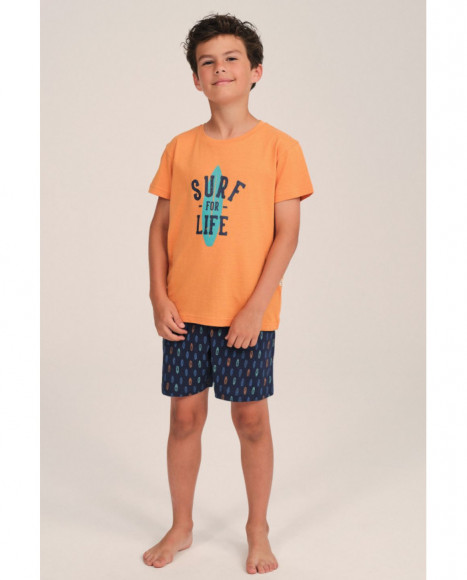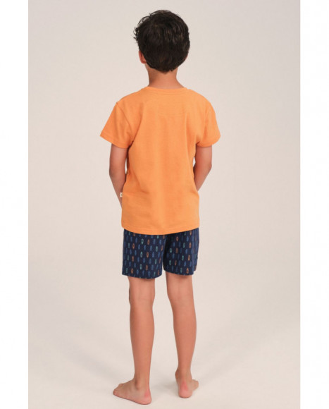 Pijama de niño compuesto por una camiseta de manga corta en color naranja con un estampado frontal de temática surf. El pantalón corto, en azul marino con un diseño de tablas de surf en tonos contrastantes, complementa el conjunto. Fabricado en tejido suave y ligero.