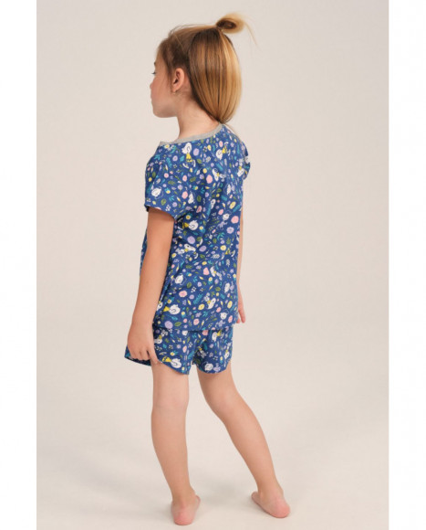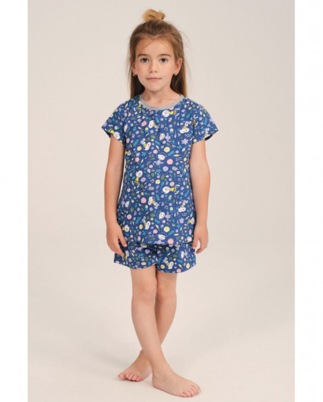 Pijama de niña con camiseta de manga corta y cuello redondo en color azul con estampado integral de Snoopy y motivos florales. Pantalón corto a juego con el mismo diseño. Confeccionado en tejido suave y transpirable.