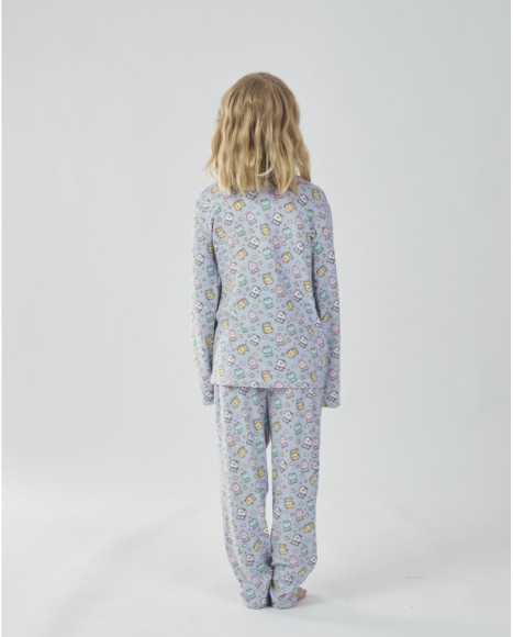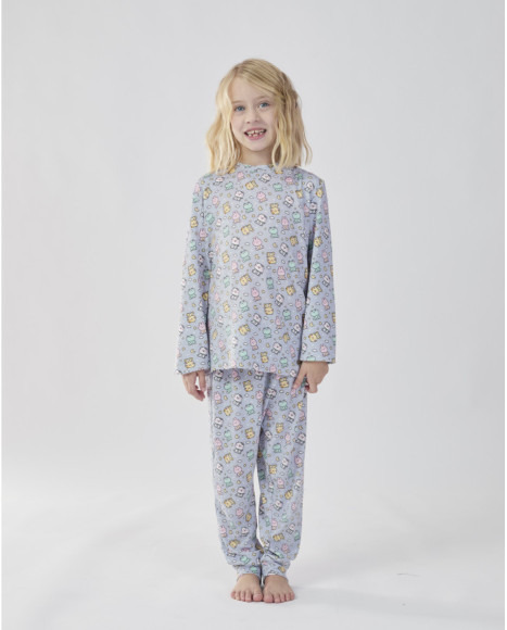 Pijama largo para niña en color claro con estampado completo de pequeños dibujos en tonos alegres, presentes tanto en la camiseta como en el pantalón. Su estilo juvenil y simpático lo convierte en una opción perfecta para la hora de dormir, aportando comodidad y libertad de movimiento. Ideal para noches acogedoras con un diseño desenfadado y alegre.